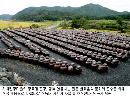 안동시는 14일 전국 처음으로 ‘아름다운 장독대 가꾸기 사업’을 추진한다고 밝혔다. 전통 발효음식의 올바른 전승과 보급, 또한 전통가옥과 잘 어울리는 실용적 장독대 설치를 통해 전통 장류 문화를 새롭게 가꿔가자는 프로젝트라고 시는 설명했다.