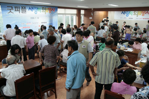 19일 오전 7시30분부터 오후 4시까지 경남 합천군 용주면사무소에서 국민일보와 굿피플 주관, 하이마트 후원으로 열린 ‘사랑의 의료봉사’에서 지역주민 500여명이 진료를 받았다.
