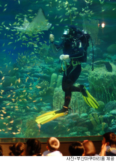 [쿠키 사회] 해저수족관 부산아쿠아리움에서 국내 처음으로 ‘가오리 먹이주기 쇼’가 펼쳐졌다.