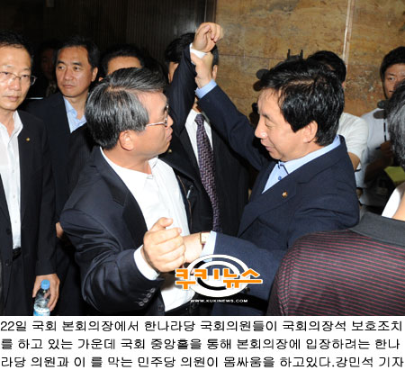 미디어법 표결은 민주당과 민주노동당등 야당의원들이 본회의장에서 여당의원들과 치열한 몸싸움을 벌이고 “직권상정 결사반대”를 외치며 항의하는 등 아수라장 속에 진행됐다. 국민일보 쿠키뉴스 고세욱 기자