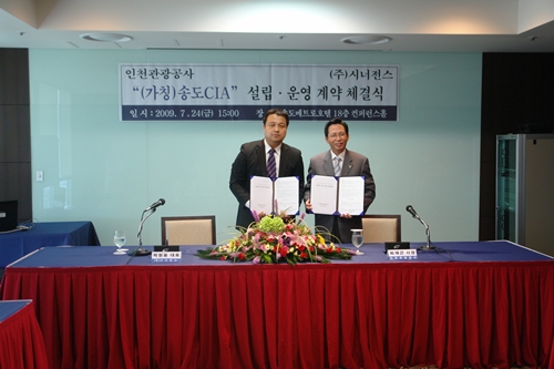 ㈜시너전스가 24일 인천경제자유구역 송도국제도시내 송도메트로호텔에서 세계 1위의 미국 요리학교 CIA(Culinary Institute of America) 사업 유치를 위한 정식 계약을 체결했다.