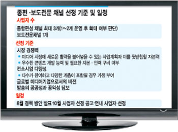 종편·보도전문 채널 사업자 선정과 관련된 정책 방향은 다음달 중 확정될 예정이지만 대략적인 가이드 라인은 이미 나와 있다.