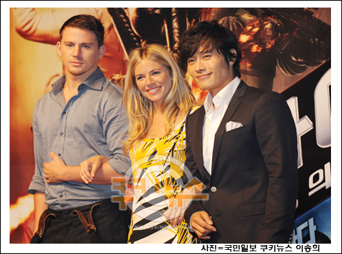 [쿠키 연예] 영화 <지.아이.조:전쟁의 서막>(이하 <지.아이.조>의 주인공들이 한국을 찾았다. <매트릭스> <해리포터와 마법사의 돌> <트랜스포머> 1,2편을 제작한 로렌조 디 보나벤츄라, <미이라> 1,2편을 연출한 스티븐 소머즈 감독, 파워풀한 댄스로 강한 인상을 남긴 <스텝 업>으로 전세계 여심을 울린 채닝 테이텀, <팩토리 걸>에서 앤디 워홀의 뮤즈로 분해 여배우의 치명적 아름다움을 보여줬던 시에나 밀러가 함께 왔다. 그리고 그 사이에 아시아를 넘어 세계로 무대를 넓힌 이병헌이 당당히 어깨를 나란히 했다.