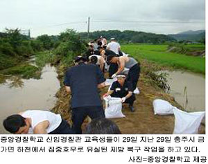 [쿠키 사회] 충북 충주시에 소재한 중앙경찰학교(학교장 김수정 치안감) 신임경찰관 교육생들이 지난 28일부터 29일까지 금가면 하천인 ‘월상천’에서 집중호우로 유실된 제방 복구 작업 등 수해복구 지원활동을 실시했다.
