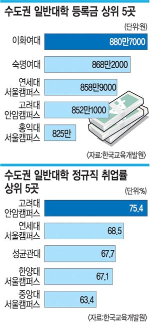 이화여대 다음으로는 숙명여대(868만2000원), 연세대 서울캠퍼스(858만9000원), 고려대 안암캠퍼스(852만1000원), 홍익대 서울캠퍼스(825만원)가 비쌌다. 학생 1인당 장학금은 서울대와 연세대 서울캠퍼스가 각각 167만3000원으로 가장 많았다. 고려대 안암캠퍼스는 166만4000원, 성균관대는 154만원이었다.