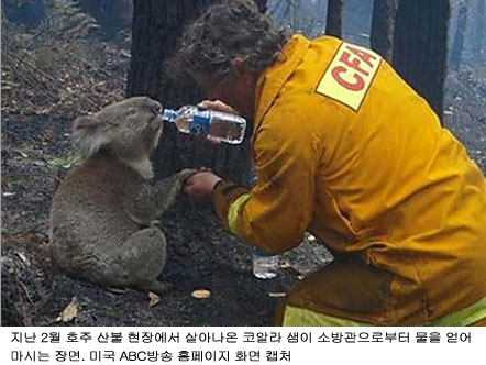 [쿠키 지구촌] 지난 2월 호주 최악의 산불 현장에서 소방관으로부터 물을 얻어마시는 장면으로 유명해진 암컷 코알라 ‘샘’이 성병으로 숨졌다고 독일 DPA통신 등 외국언론이 6일 일제히 보도했다.