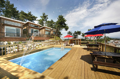 충남 태안군의 ‘두바다찬솔(사진)’ 펜션도 바다 바로 옆에 수영장과 테라스를 갖추고 있어 바다를 보며 선탠을 하거나 차 한잔의 여유를 느낄 수 있다.