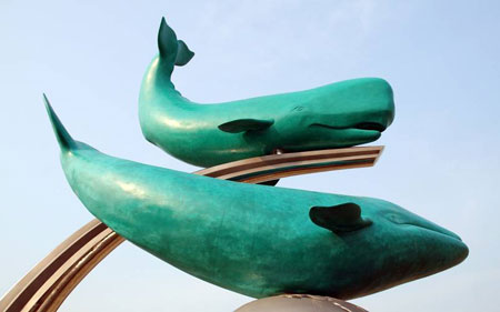 고래 조형물은 가로 550㎝, 세로 480㎝, 높이 610㎝의 브론즈상이며, 오대양 육대주를 의미하는 지구본과 거대한 아치 사이를 자유롭게 항해하는 모습을 형상화한 것이다. 국내 유명 아티스트 이영송과 디자인건축회사 소토의 한정호 대표가 12개월에 걸쳐 완성했다.