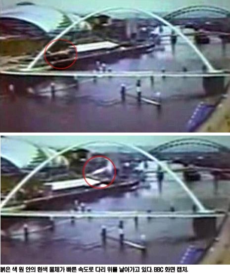 BBC가 공개한 영상에 따르면 브릭스가 뉴스를 읽는 동안 중부 뉴캐슬을 가로지르는 타인강의 밀레니엄브리지를 비추고 있던 스크린 왼쪽 하단에서 한 물체가 45도 각도로 오른쪽 상단을 향해 엄청난 스피드로 날아갔다.