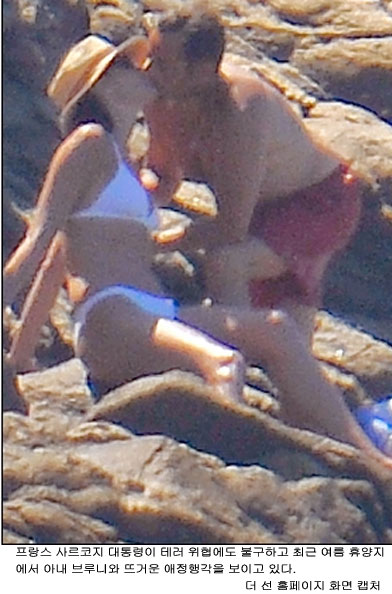 언론에 공개된 사진을 보면 빨간색 수영복을 입은 사르코지 대통령은 바닷가 바위에서 하얀색 비키니를 입은 브루니 여사와 뜨거운 키스를 하고 있다.