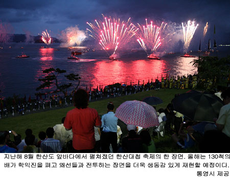 16일까지 닷새간 계속될 축제의 백미는 역시 417년전의 한산대첩을 재현하는 15일 저녁 행사. 오후 7시 한산도 앞바다로 나간 130척의 선박들이 일사불란하게 ‘학익진’을 펼치면서 요란한 대포소리와 함께 불꽃과 레이저를 쏘는 등 밤하늘을 포성과 섬광으로 수놓게 된다.