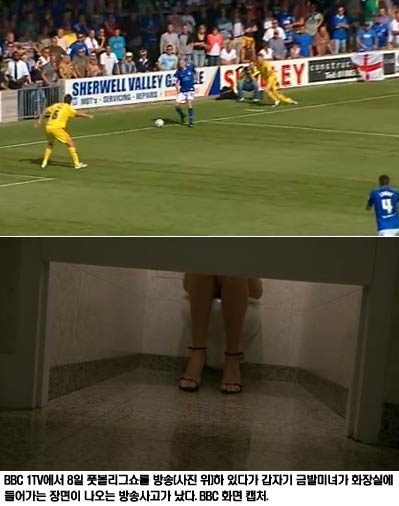 [쿠키 톡톡] 영국 공영방송 BBC가 축구 하일라이트 방송 도중 금발 미녀가 화장실에서 ‘볼일’을 보는 엉뚱한 화면을 내보내는 사고를 쳤다.