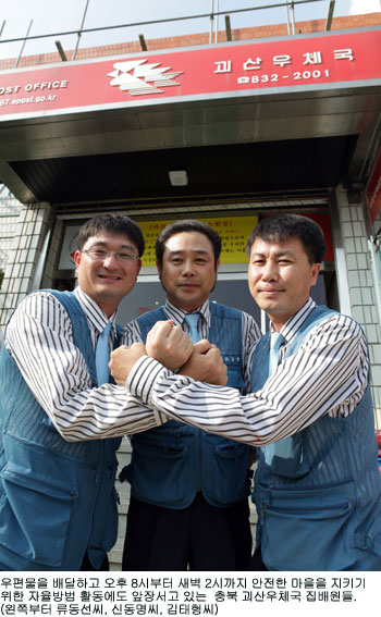 주인공은 충북 괴산우체국 집배원인 신동명(47)·김태형(43)·류동선(33)씨 3총사. 이들은 괴산읍내에서 우범지역 순찰과 학생들 귀가 시 차량운행 등 자율방범대원들과 함께 지역 안정에 톡톡히 한몫 하고 있다.