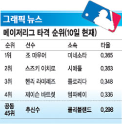 [쿠키 스포츠] 추신수(27·클리블랜드)가 3안타를 몰아치며 타율을 0.298로 끌어올려 3할 재진입을 눈 앞에 두게 됐다. 추신수의 타율은 지난 달 초 0.304까지 올라갔다가 올스타전 휴식기를 전후로 주춤하면서 0.282까지 떨어졌으나 다시 상승세로 돌아섰다.