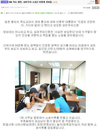 이에 이 부대변인은 11일 포털사이트 다음 ‘아고라’의 자유 토론방에 “일본 총리의 독도 교과서 게재 통고에 대해 이명박 대통령이 ‘지금은 곤란하다, 기다려 달라’고 했다고 보도한 요미우리신문. (당시) 청와대는 아니라고 하고, 요미우리신문은 ‘사실만 보도한다’는데 누구 말이 맞는지 진상을 규명하고 책임을 묻는 소송을 준비중”이라고 밝혔다.