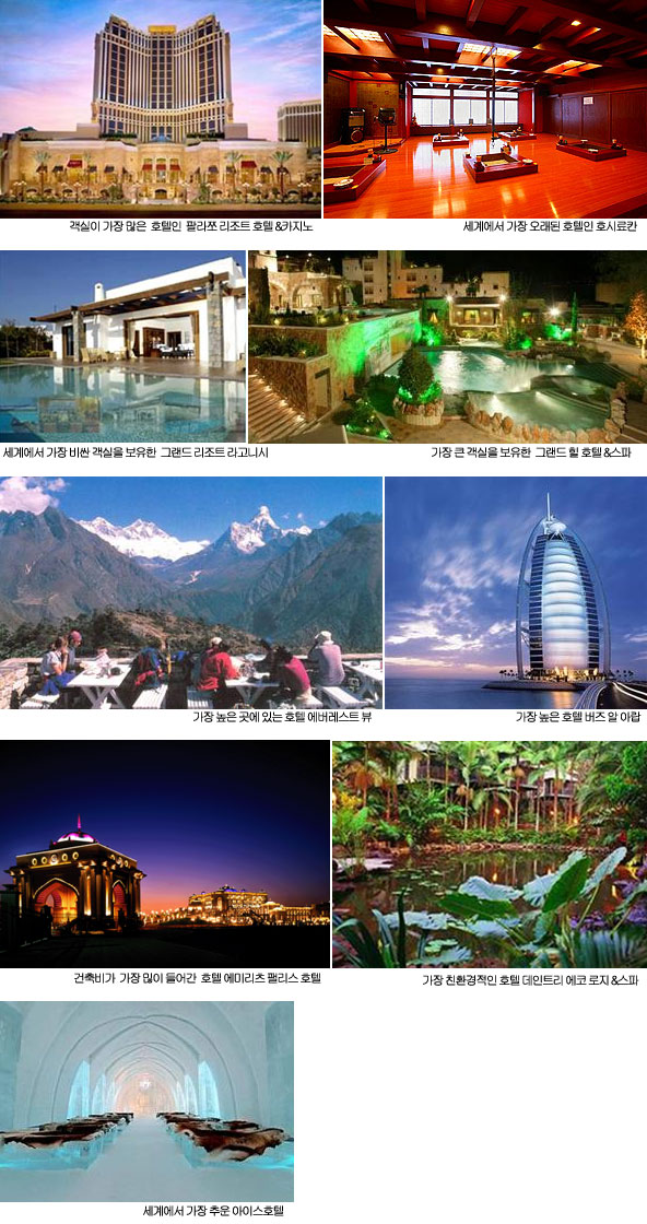 9곳을 선정, 18일 소개했다. ‘세계 최고’ 명단에 오른 호텔들은 세계 최고(最古)의 명성뿐만 아니라 세계에서 가장 높은 호텔, 세계에서 가장 추운 호텔, 세계에서 가장 친환경적인 호텔 등 다양한 기록들을 보유하고 있다.