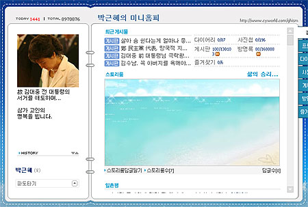박 전 대표는 그러나 미니홈피 게시판에는 별다른 글을 남기지 않았다. 대신 자유게시판과 방명록에는 김 전 대통령의 서거를 애도하는 방문자들의 글들이 속속 올라오고 있다.