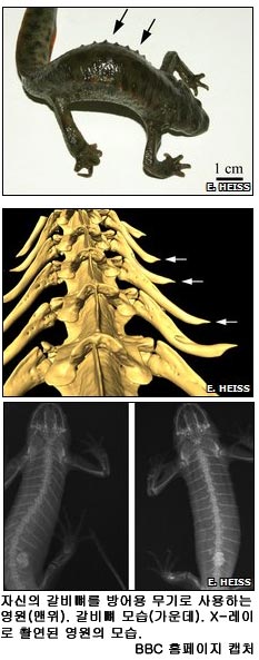 스페인에서 발견된 이 영원(newt)은 포식자가 공격을 해올 경우 자신의 날카로운 갈비뼈를 몸통 바깥으로 돌출시켜 마치 독가시인 것처럼 방어하는 것으로 밝혀졌다고 영국 BBC 인터넷판이 최근 보도했다. 이 영원은 공격을 당할 때마다 갈비뼈를 바깥으로 돌출시키는 행동을 반복하며 이 갈비뼈는 다른 동물들이 가지고 있는 가시와 형태나 기능면에서 유사하다고 과학자들은 전했다.