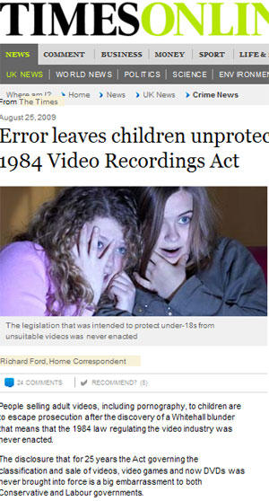 영국의 타임스 온라인(www.timesonline.co.uk) 등 현지 언론의 최근 보도에 따르면 1984년 만들어진 비디오 관련 법(Video Recordings Act·이하 VRA)이 제대로 절차를 거치지 못해 법적 효력이 없다는 사실이 드러났다.