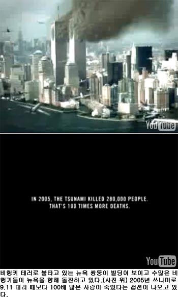 이 동영상에는 9·11 테러 당시 비행기 두 대가 차례로 쌍둥이 빌딩에 부딪히는 모습이 먼저 나오고 당시 2819명이 죽었다는 캡션이 나온다. 이어 불타고 있는 쌍둥이 빌딩을 배경으로 한 뉴욕 맨해튼을 향해 수십대의 비행기가 자폭테러를 하려는 듯 날아가는 영상이 나온다. 이 장면 뒤에는 ‘2005년 쓰나미로 28만명이 죽었으며 이는 9·11 때 사망자보다 100배 많다’는 문구가 나온다.