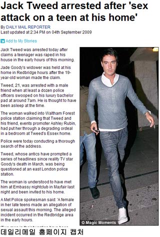 [쿠키 톡톡] 시한부 인생의 TV리얼리티쇼 스타 제이드 구디와 동화처럼 결혼해 영국인들에게 감동을 선사했던 잭 트위드(21)가 10대 소녀를 성폭행한 혐의로 경찰에 검거돼 충격을 주고 있다.