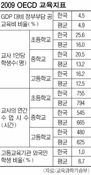 교육지표에서 우리나라 국내총생산(GDP) 대비 정부가 부담하는 공교육비 비율은 4.5%로 OECD 평균(4.9%)보다 낮았다. 반면 공교육비에서 차지하는 민간 부담률은 2.9%로 조사대상 국가들 중 가장 높았다. OECD 평균은 0.8%에 불과했다. 공교육비의 민간 부담률이 높다는 것은 그만큼 교육에 대한 정부 지원이 부족해 국민이 부담해야 하는 정도가 크다는 것을 의미한다. 이에 따라 정부가 지출하는 학생 1인당 공교육비 지출액은 초등학교 4935달러, 중학교 7261달러, 고등학교 8564달러로 모두 OECD 평균에 못 미쳤다. 정부가 부담하지 못하는 공교육비가 일반 국민의 호주머니에서 나오고 있는 셈이다.