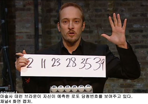 [쿠키 지구촌] 지난 9일(현지시간) TV에 출연해 로또 1등 당첨번호 6자리를 정확히 예측해 세계를 깜짝 놀라게 한 영국 마술사 대런 브라운이 그 비법을 공개했다. 하지만 그가 밝힌 비법은 매우 단순해 네티즌들은 “그저 속임수였을 것”이라는 시큰둥한 반응을 보이고 있다.