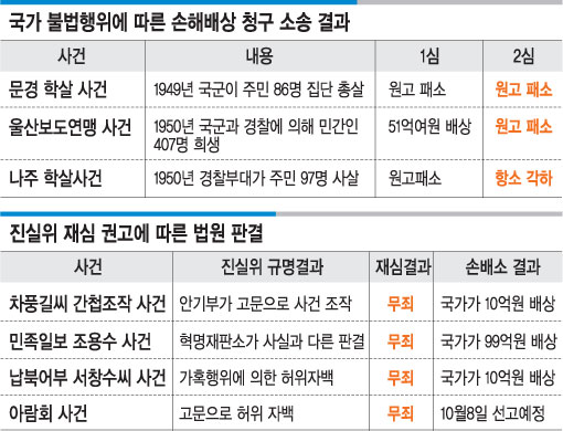 ◇국가 상대 손배소는 모두 패소=진실·화해를 위한 과거사정리위원회(진실위)가 일제 강점기 이후 국가 불법행위로 규정한 사건은 모두 74건이다. 이 가운데 피해자 유족들이 국가를 상대로 손해배상을 청구한 사건은 1949년 문경 학살 사건과 50년 울산보도연맹사건, 나주 학살 사건 등 3건이다.