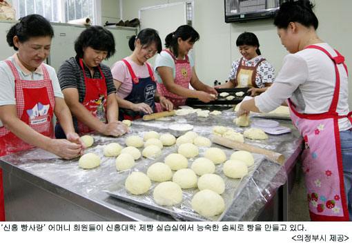 경기도 의정부시 호원동 신흥대학 제빵실은 매주 월요일마다 불우이웃에 제공할 빵을 만드는 봉사모임 ‘신흥 빵사랑’ 어머니 회원 7명의 작업실이 된다.