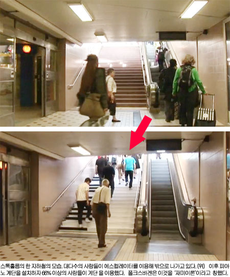 그러나 계단을 밟을 때마다 여러 높낮이의 음이 나오는 ‘피아노 계단’을 설치하자 사람들은 피아노 외형을 닮은 계단에 관심을 보이기 시작한다. 계단을 이용하는 사람이 눈에 띄게 증가한다. 일부러 음을 내려고 올라가던 길을 다시 내려오는가하면 여러 사람이 함께 걸어가면서 화음을 선보이기도 한다.