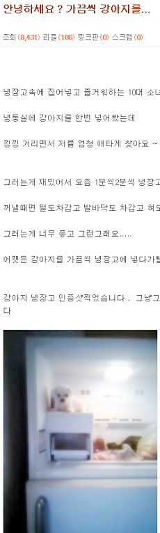 그는 글에서 “냉장고 속에 (강아지를) 집어넣고 즐거워하는 10대 소녀입니다”라고 자신을 소개한 뒤 “냉동실에 강아지를 한번 넣어봤는데 낑낑거리면서 저를 엄청 애타게 찾아요”라고 적었다.