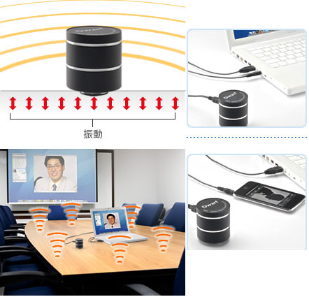 사용 방법은 간단하다. 235g의 작은 원통형 제품을 컴퓨터에 연결한다. 그리고 제품에 붙어있는 실리콘을 이용해 책상에 붙이면 책상 전체가 스피커 역할을 하며 소리를 낸다. 내장된 진동판을 활용, 책상 전체를 스피커로 활용하는 것이다.