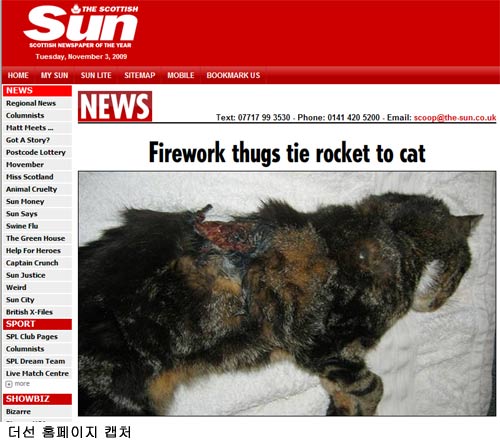 [쿠키 톡톡] 폭죽에다 고양이를 매달아 쏘아 올리는 장난으로 고양이를 죽인 사건이 영국 스코틀랜드에서 발생해 동물애호가들이 발끈하고 나섰다.