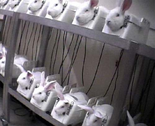영국에서 노화방지실험에 동원된 토끼들이 실험실 내에서 몸통이 꽉 끼는 작은 박스 안에서 옴짝달싹 못한 채 실험을 당하고 있는 사진이 공개되면서 내무부가 조사에 나섰다고 영국 대중지 더선이 4일 보도했다.
