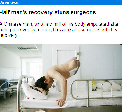 화제의 주인공은 펭 수이린(37)씨. 아바노바 온라인 판을 통해 공개된 사진 속에서 펭씨는 병원 침대에서 팔굽혀펴기를 하며 상체를 있는 힘껏 들어올렸다. 하반신을 교묘하게 지운 합성 사진이라고 해도 믿을 만큼 그의 상체는 근육질의 건강한 모습이었다.