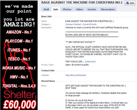 이달 초 미국판 싸이월드 페이스북에서는 영국 네티즌을 중심으로 해체한 미국 하드코어 밴드 ‘레이지 어게인스트 더 머신(Rage Against The Machine· RATM)’의 1992년 데뷔 앨범 수록 곡을 올해의 영국 크리스마스 시즌 싱글 차트 1위로 만들자는 캠페인(사진)이 벌어졌다.
