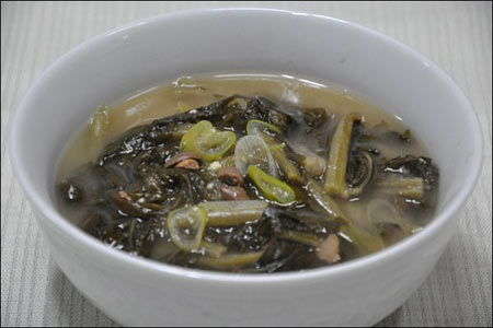 -재료: 멸치 다시다 물 8컵, 무청시래기 130g, 날콩가루 2분의1컵, 된장 2숟가락, 포도씨유 1숟가락, 파
