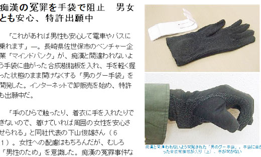남녀 모두 치한으로부터 해방될 수 있는 아이디어 장갑이 일본에서 발명돼 특허 출원을 앞두고 있다고 일본 교도통신이 최근 보도했다.