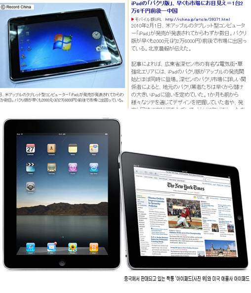 [쿠키 톡톡] 미국 애플사의 야심작 태블릿PC ‘아이패드’ 출시 소식과 동시에 중국에서 모조품이 나왔다고 중국뉴스사이트 레코드 차이나가 2일 보도했다.