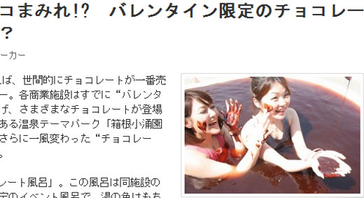 유명 관광지인 가나가와현 하코네에 위치한 온천 테마파크에 최근 선보인 초콜릿 목욕탕은 다갈색의 끈적이는 초콜릿 원액을 부어 만들었다. 카카오 향기가 감돌아 마치 따뜻한 초콜릿 음료 속에 잠기는 기분을 만끽할 수 있다고 도쿄 워커는 설명했다.