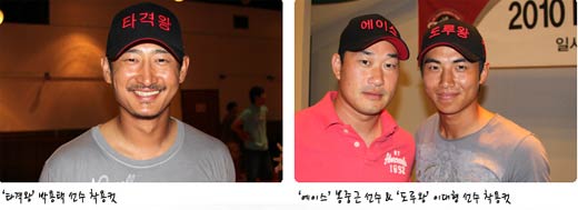 검은색 모자에는 각각 ‘도루왕’ ‘타격왕’ ‘에이스’ 란 단어가 붉은색 글씨로 큼지막하게 적혀있다.