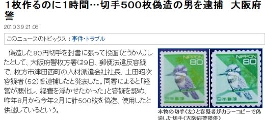 그가 위조한 우표는 80엔(약 1000원)짜리였다. 그는 회사 복사기로 복사한 뒤 문구용 칼로 구멍을 내는 등 완전한 수작업으로 우표를 만들어 회사 소개 책자에 붙여 편지를 부쳤다.
