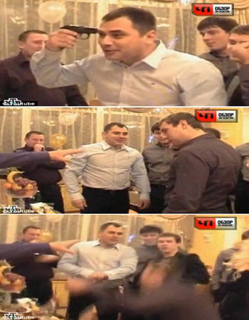 [쿠키 톡톡] 친구 결혼식장에서 권총으로 러시안룰렛 게임을 하다 하객 중 한 명이 두개골에 중상을 입고 의식불명 상태에 빠지는 사건이 러시아에서 발생했다. 당시 현장이 그대로 찍힌 동영상이 인터넷으로 유포되면서 보는 이들을 경악케 하고 있다.