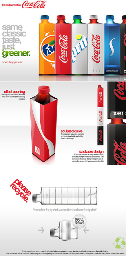 바닥에 병뚜껑이 들어 갈 정도의 홈을 파 다른 병을 포개어 쌓을 수 있도록 설계했다. 또 병뚜껑 사이즈도 25% 줄여 전체적인 운송비를 절감할 수 있도록 만들었다. 다 마신 병은 아코디언처럼 접어 최대 66%까지 작게 만들 수 있다.