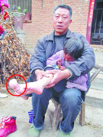 허난성 난양에 사는 연연은 왼쪽 발의 엄지발가락이 정상 아이보다 훨씬 크다. 한 개의 발가락이 웬만한 아이의 주먹만하다. 아이의 어머니는 “태어났을 때부터 약간 컸지만 당시에는 크게 신경 쓰지 않았다”고 말했다.