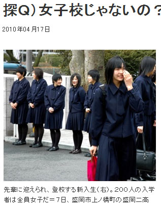 아사히신문 온라인판 17일 보도에 따르면 일본 혼슈 이와테현 모리오카시의 모리오카2고등학교에 올해 입학한 신입생 200명은 모두 여자다. 전교생 603명도 여학생이다.
