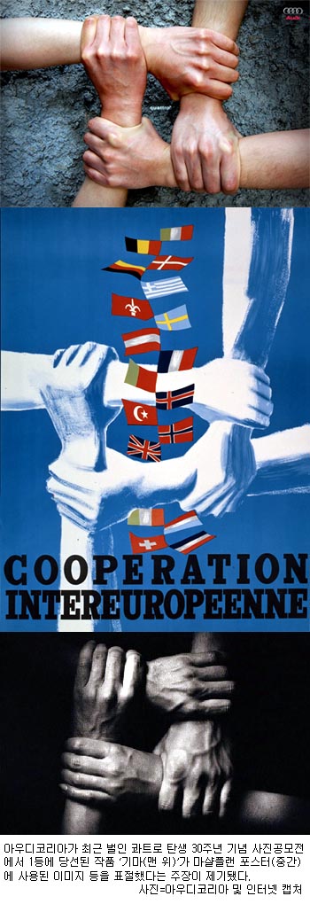 인터넷 아이디 ‘Q5’ 네티즌은 6일 본보에 보낸 이메일 제보에서 “아우디코리아의 사진공모전에서 마샬플랜 홍보 포스터 등에 사용된 이미지를 그대로 베낀 작품이 1등에 뽑혔다”며 “공모전은 순수창작물로 제한돼야하는만큼 작품 선정에 문제가 있다”고 주장했다.