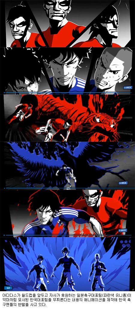 [쿠키 톡톡] 세계적인 스포츠용품 메이커인 아디다스가 월드컵을 앞두고 자사가 후원하는 일본축구대표팀이 악마 형상의 한국축구대표팀을 물리친다는 자극적인 애니메이션을 제작해 한국 축구팬들의 반발을 사고 있다.