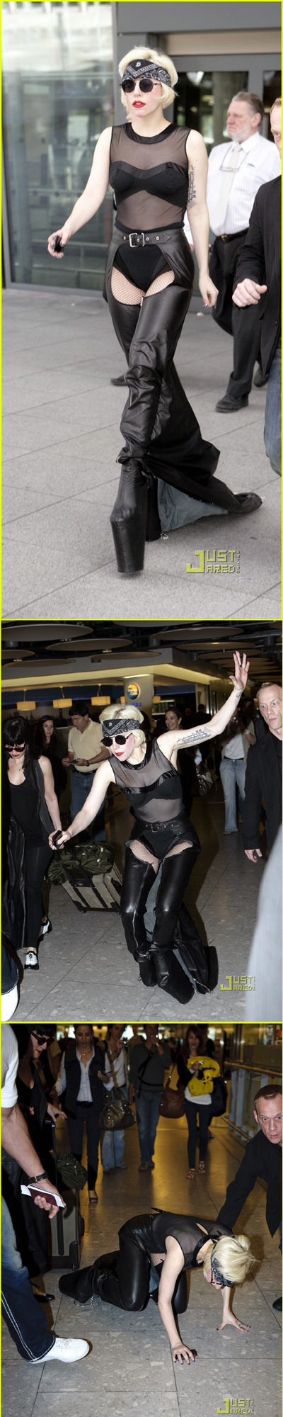 미국 연예 정보 사이트 저스트자레드는 지난 23일 레이디 가가가 영국 런던 히드로 공항에서 하이힐의 높은 굽에서 균형을 잃고 자빠지는 굴욕을 당했다고 보도했다.