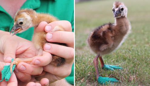 동물원측은 120cm까지 자라는 아기 새가 커다란 몸을 스스로 지탱할 수 있는 방법을 강구했다. 발에 붕대를 감았더니 새끼는 약간 휘청댔지만 스스로 걸어 나갔다.